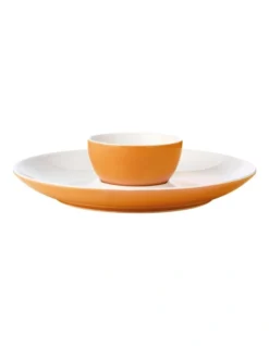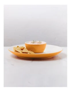 The Mezze chip & dip in ochre is a contemporary take on a classic party favourite. Simple and stylish, this unique chip & dip set is finished with a bold coloured glaze that contrasts smartly with the white gloss interior. Perfect for your favourite snacks, dips and salsas, it has an effortless elegance that’s sure to make an impression. Made from quality porcelain, it coordinates beautifully with the rest of the Mezze collection.